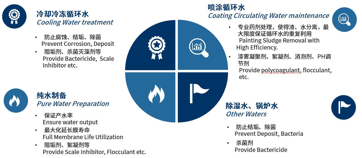 經由這些方案的執行與正確地偵測,冷卻系統的水所發生的諸多問題都能被良好控制住。我們將與您共同為您的工廠選定正確的處理方案,包括合適的藥品、正確地運用所須的訓練和維持您的冷卻系統所須的適當藥量之偵測步驟。